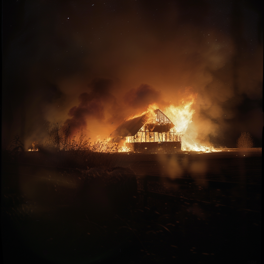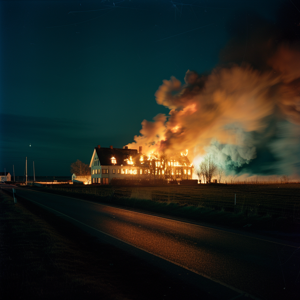 Det var en stille nat, kun afbrudt af knitrende flammer og træ, der gav efter for varmen. Synet af ilden, der fortærede strukturen, var betagende og hypnotisk. Flammerne lyste op i mørket og skabte et skær, der kunne ses på lang afstand.